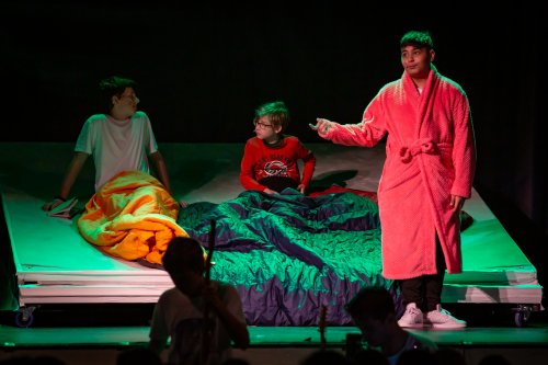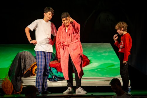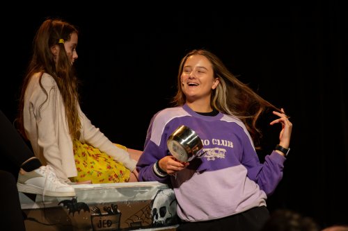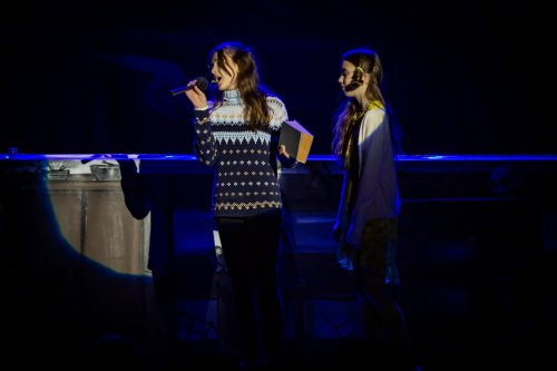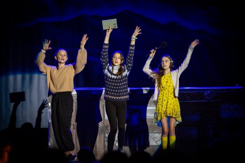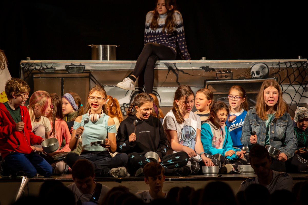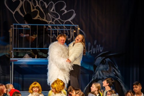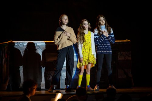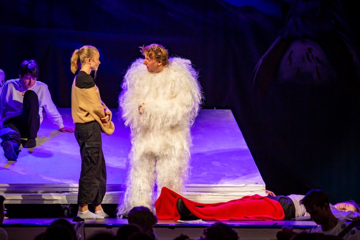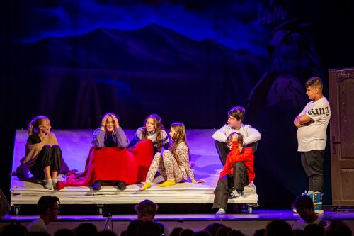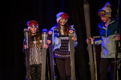 Skupina žáků vyráží lyžovat na spartánskou horskou chatu, kterou provozuje svérázná rodina sester Veverkových. Jak si porozumí namistrovaná městská parta s děvčaty, která jsou zvyklá sama přežít v divočině? A odkud se v noci ozývá to tajuplné houkání? Fotografie pocházejí z představení pro školy dne 24.5.2023.